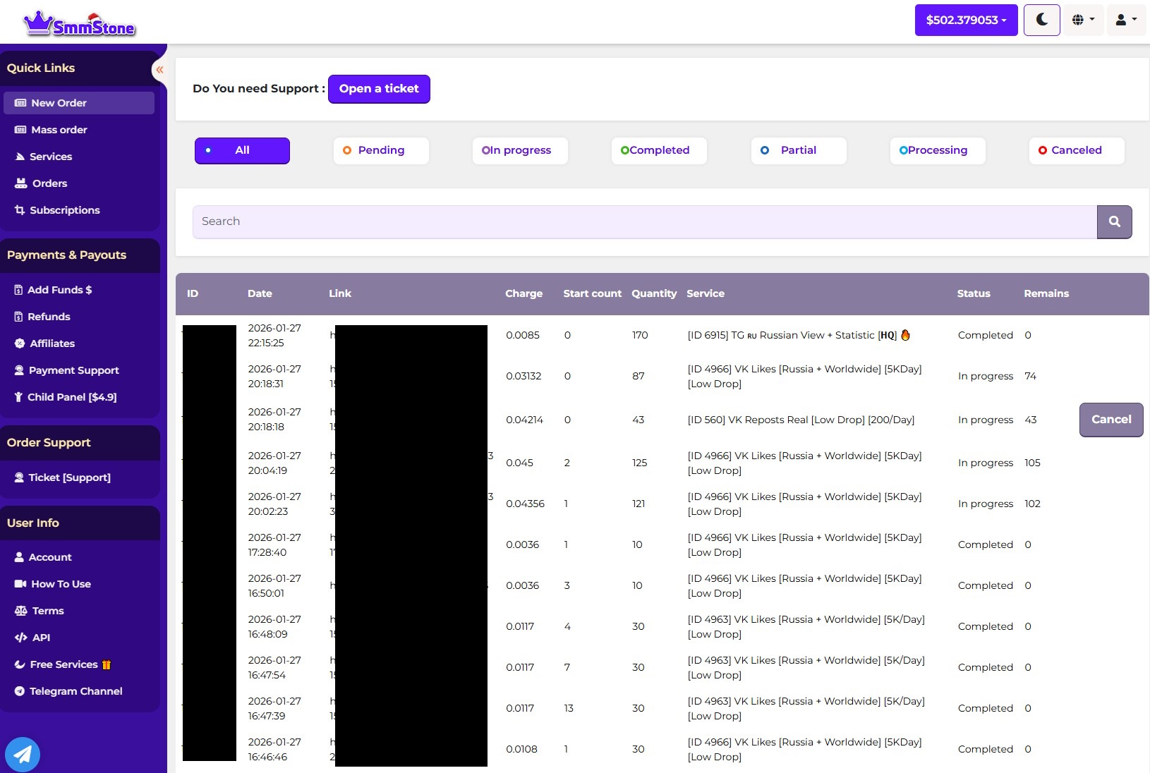 Регулярно закупаюсь на smmstone. Очень много услуг, правда не все всегда стабильно отрабатывают. В поддержке (тикетах) раньше отвечали так как будто "лишь бы отстали" от них, но со временем создали отдельную группу в телеграм (после определённых трат), где более оперативно стали решать вопросы. В среднем 7 из 10 заказов отменяют сами быстро (если долго не запускаются), некоторые приходится долго ждать (доходило и до недели), как понял тоже зависит от услуг (собственные услуги или те что перепродают).